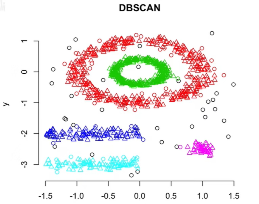 - DBSCAN(Density-Based Spatial Clustering of Applications with Noise):基于数据点的密度分布,将高密度区域划分为簇,低密度区域视为噪声。优点:不需要预先指定簇数,能识别任意形状的簇,对噪声鲁棒。缺点:对参数 \epsilonϵ(邻域半径)和 \text{minPts}minPts 敏感。