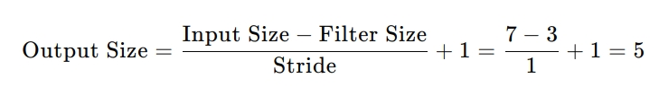 例如,假设输入是一个大小为 7×7 的图像,滤波器大小为 3×3,步长为1,没有填充(No Padding)。那么输出特征图的大小为5x5: