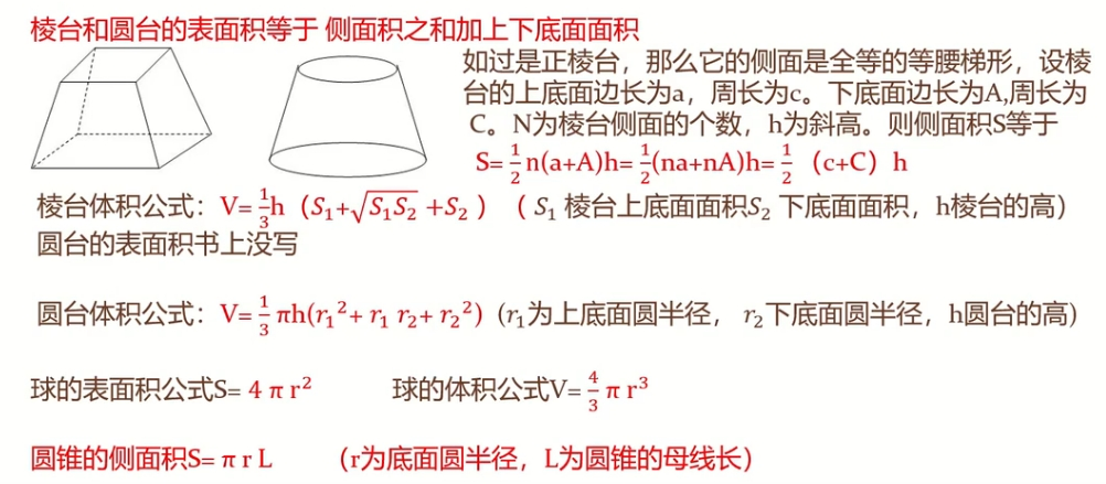 圆柱,圆锥,圆台,球: