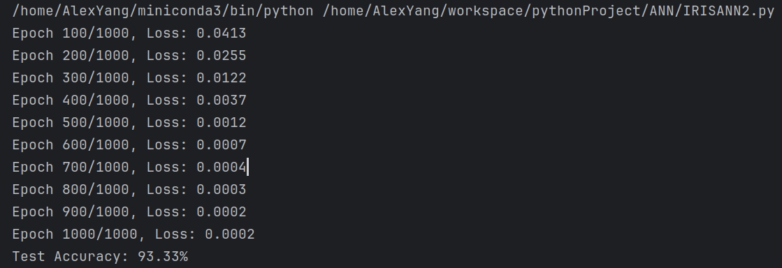 with torch.no_grad(): y_pred = model(X_test_tensor) predicted_labels = torch.argmax(y_pred, dim=1) accuracy = accuracy_score(y_test, predicted_labels) print(f"Test Accuracy: {accuracy:.2%}")