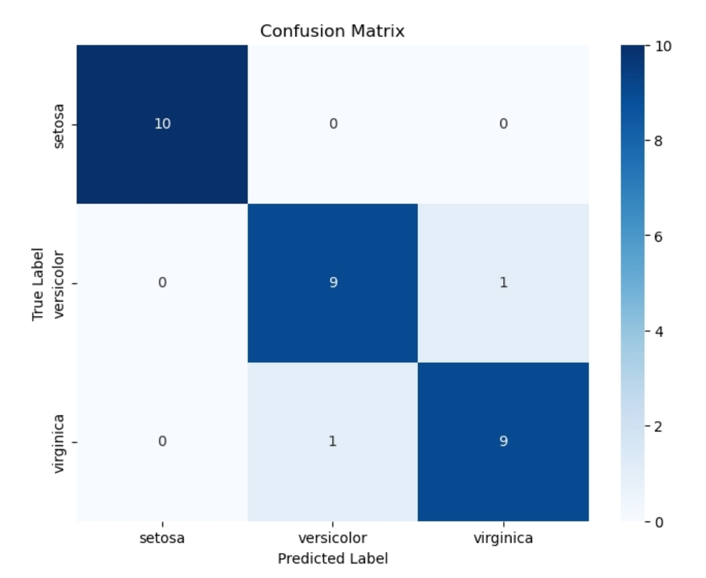 cm = confusion_matrix(y_test, predicted_labels) plt.figure(figsize=(8, 6)) sns.heatmap( cm, annot=True, fmt="d", cmap="Blues", xticklabels=iris.target_names, yticklabels=iris.target_names, ) plt.xlabel("Predicted Label") plt.ylabel("True Label") plt.title("Confusion Matrix") plt.show()