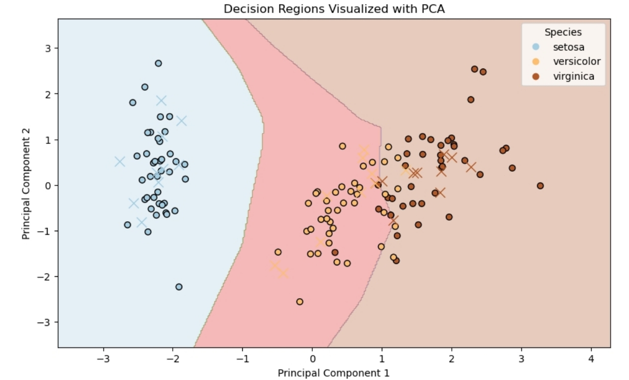 plt.figure(figsize=(10, 6)) plt.contourf(xx, yy, Z, alpha=0.3, cmap="Paired") scatter = plt.scatter( X_train_pca[:, 0], X_train_pca[:, 1], c=y_train, cmap="Paired", edgecolors="k", label="Train", ) plt.scatter( X_test_pca[:, 0], X_test_pca[:, 1], c=y_test, cmap="Paired", marker="x", s=100, linewidth=1, label="Test", ) plt.xlabel("Principal Component 1") plt.ylabel("Principal Component 2") plt.legend( handles=scatter.legend_elements()[0], labels=iris.target_names.tolist(), title="Species", ) plt.title("Decision Regions Visualized with PCA") plt.show()