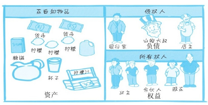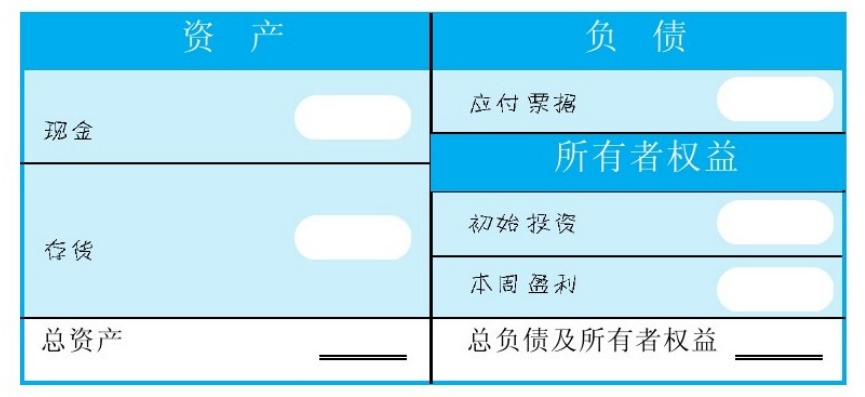 记账卡的左边永远等于右边:资产=负债+所有者权益(股东权益或净值)