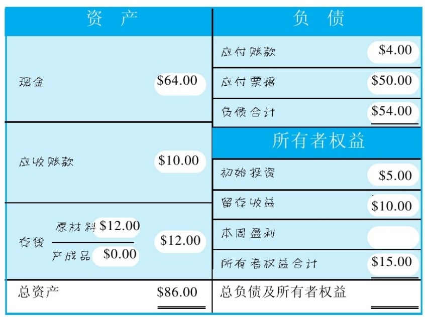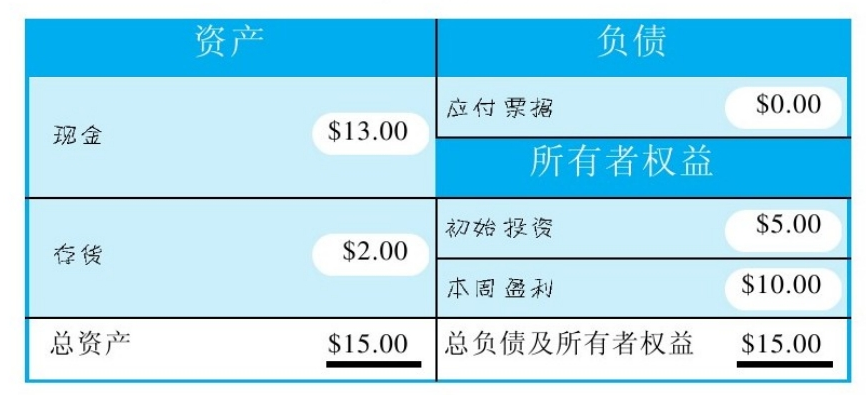 - 右边:新增本周盈利,属于所有者权益,15美元,与左边相等