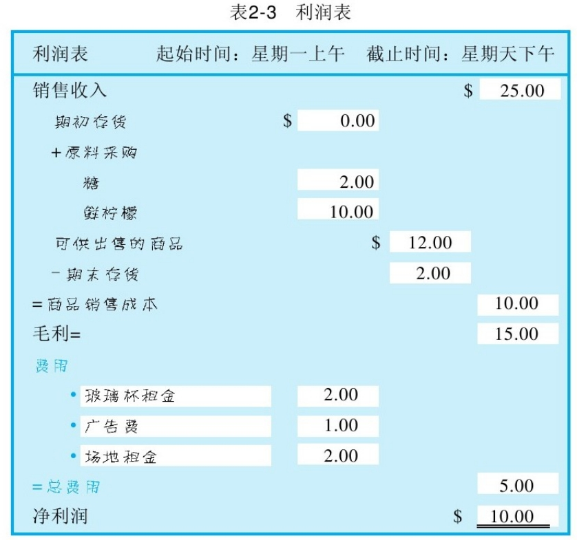 - 总费用5元:玻璃杯租金2元,广告费1元,场地租金2元 ->从本周盈利扣除5元,现金减少5元